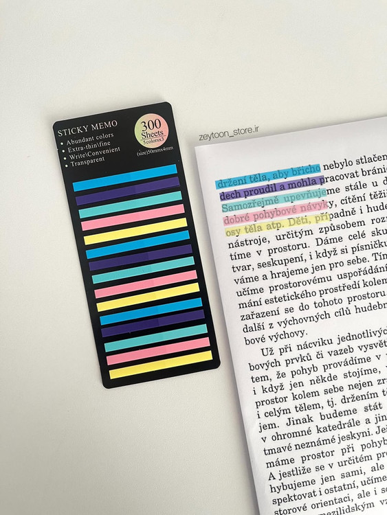 هایلایت کردن نکات مهم بدون اسیب زدن به برگه کتابت! مشخصات: طول ۵cm ۳۰۰برگه با ۵ طیف رنگی چند بار مصرف ثبت از طریق